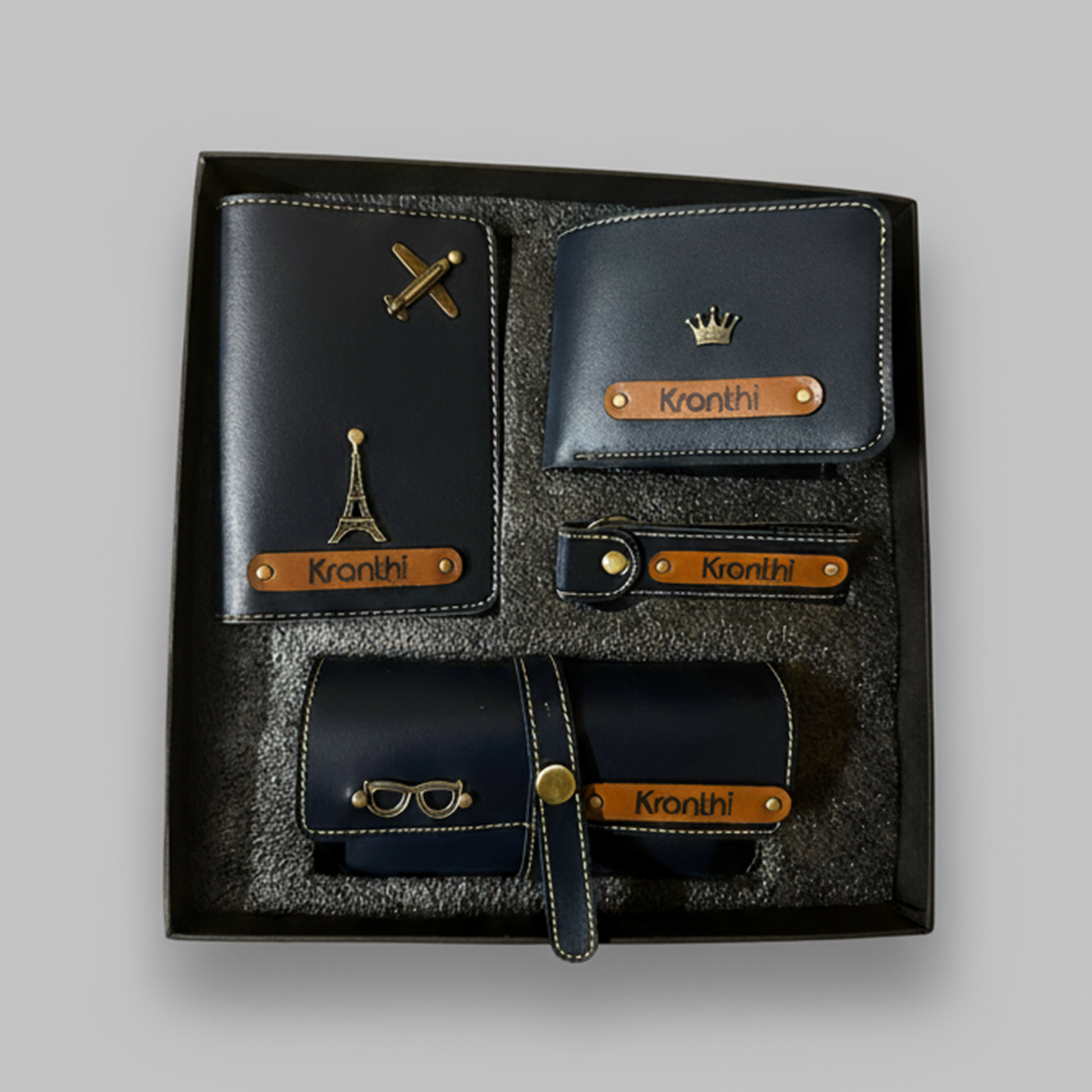 Make gifting unforgettable with this elegant 5-in-1 personalized leather gift set. Crafted for style and utility, the combo includes a passport cover, wallet, sunglasses case, keychain, and cord organizer — all beautifully customized with the recipient's name and metal charms. Perfect for birthdays, anniversaries, corporate gifting, or festive occasions.